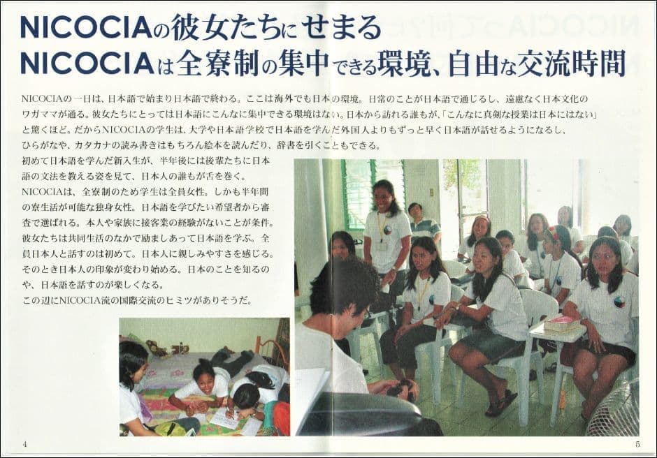 A day for NICOCIA students begins with Japanese and ends with Japanese. Even though it's overseas, this is a Japanese environment. Everyday things can be communicated in Japanese, and there's no need to hold back on expressing the quirks of Japanese culture. There is no environment where the students can focus on Japanese to this extent. Everyone visiting from Japan is surprised, saying, "There are no classes this serious in Japan." That's why NICOCIA students can speak Japanese much faster than those who have studied Japanese at universities or Japanese language schools. Not only can they read and write hiragana and katakana, they also become able to read picture books and look up words in dictionaries. Seeing the freshmen who start learning Japanese for the first time teaching Japanese grammar to their juniors half a year later astonishes everyone from Japan who visits. NICOCIA is fully residential in order to provide such a focused environment. Because of the full residency, all students are women, and moreover, they are single women who can live in the dormitory for six months. Students are selected through an examination from those who are inexperienced in Japan but wish to learn Japanese. Students learn Japanese while encouraging each other in a shared life. All the students are interacting with Japanese people for the first time, but everyone begins to feel a familiarity with Japanese people. That's when their impression of Japanese people starts to change, and they start to find it fun to know about Japan and speak Japanese.This seems to be the secret of NICOCIA's unique international exchange."